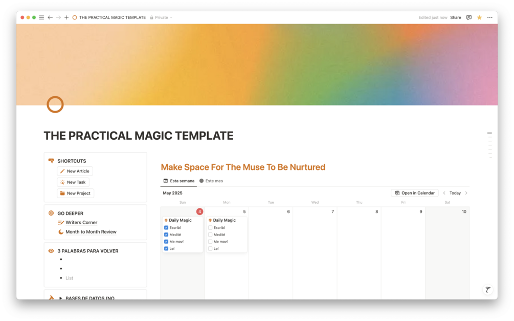 The Practical Magic Template es el único template de Notion que necesitas para organizar tus proyectos y negocio creativo. Además del template, te daré una guía pre grabada e instrucciones escritas para que aprendas a usar cada sección y puedas aprovechar el template al máximo.